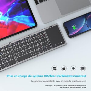 Clavier sans Fil avec pavé Tactile Sensible, Rechargeable, Portable et Pliable, Clavier Dual Bluetooth pour Ordinateur Portable/Tablette/iPad/Smart TV -Compatible Windows, iOS, Mac OS, Android – Gris