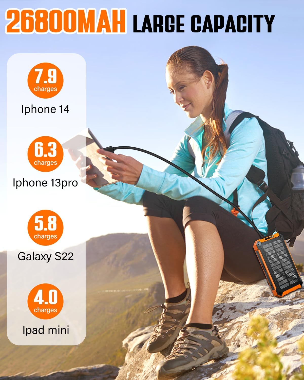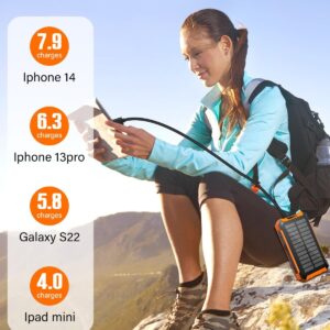 • 【Grande capacité de 26 800 mAh】 La banque d’alimentation avec panneau solaire dispose d’une batterie haute capacité intégrée de 26 800 mAh. Lorsqu’il est complètement chargé, il peut charger votre téléphone mobile 7 à 8 fois, suffisamment pour répondre à vos besoins électriques toute la journée lorsque vous voyagez à l’extérieur.
