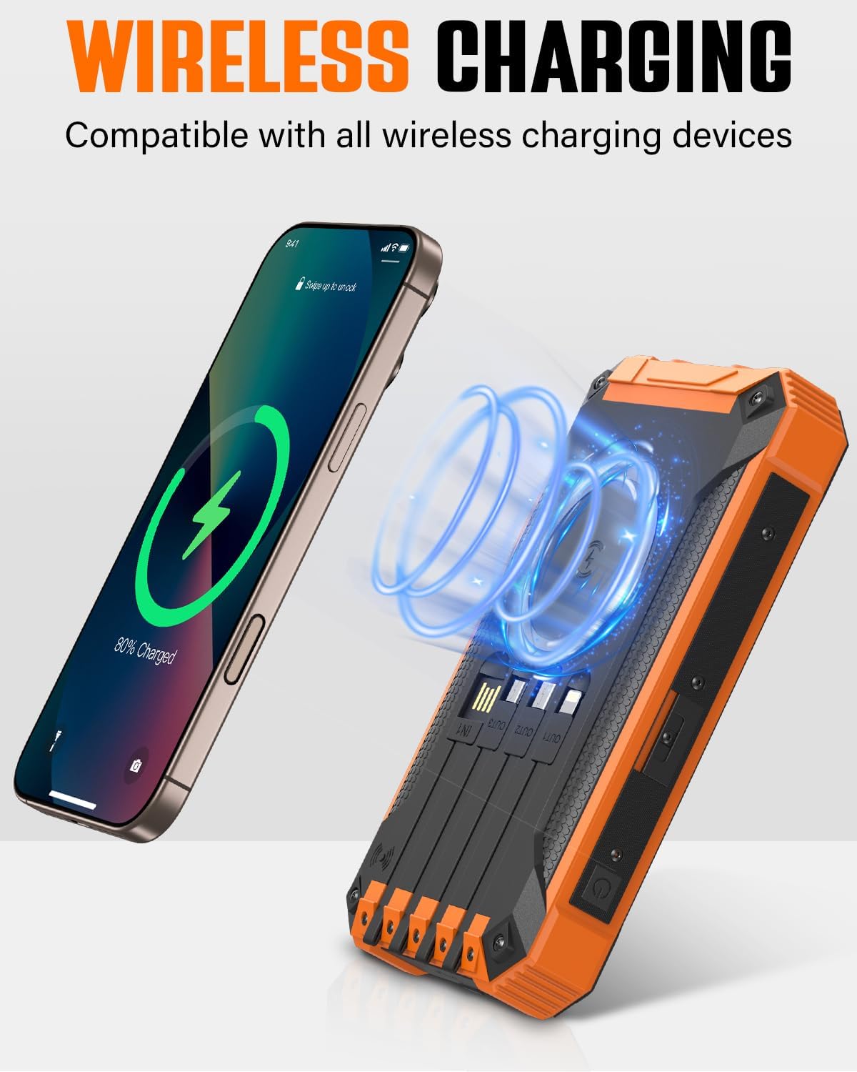• 【Chargement sans fil】Cette batterie externe solaire prend en charge le chargement sans fil et est compatible avec tous les appareils sans fil. Par exemple, les séries iPhone 14/13/12, les séries Samsung Galaxy S23/S22/S21, etc. Placez votre appareil dans la zone de chargement sans fil et il se chargera instantanément. Venez profiter de votre temps de recharge sans fil.