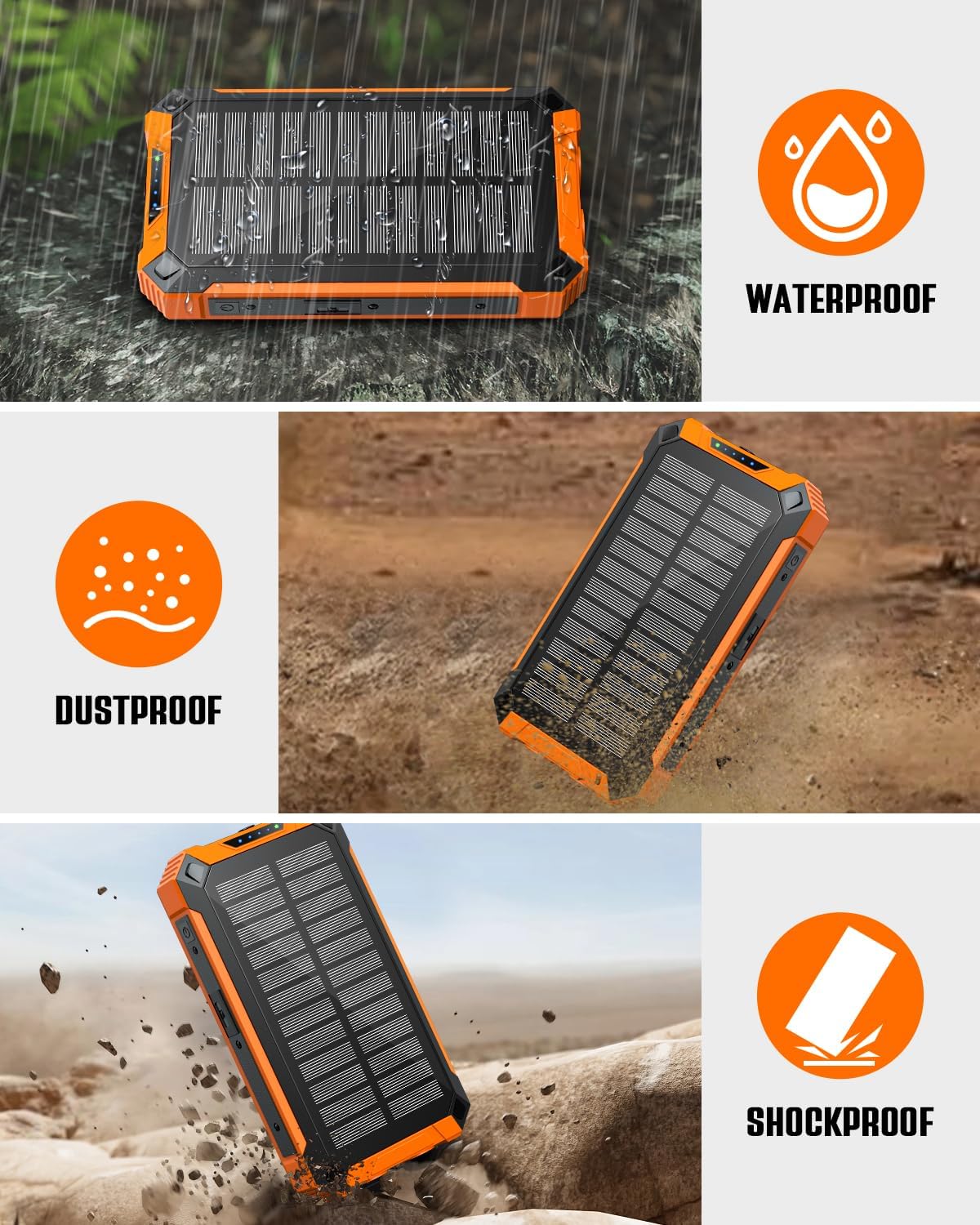• 【Conception extérieure robuste】 Les banques d’énergie solaire d’extérieur contiennent deux grandes lampes de poche LED qui fournissent un éclairage de secours la nuit. Conception étanche, anti-poussière et antichoc, parfaitement adaptable à diverses conditions météorologiques et environnements difficiles, ce qui en fait un équipement essentiel pour les aventures en plein air.