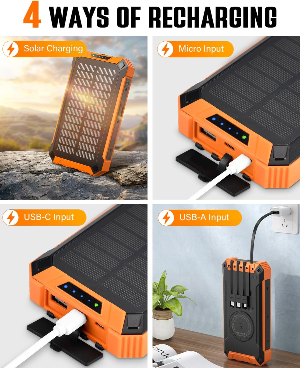 • 【4 méthodes de charge】Étant donné que la banque d’énergie solaire est équipée de 3 interfaces d’entrée et de panneaux solaires, vous pouvez la charger via quatre méthodes de charge : USB-A, USB-C, Micro et Solaire, qui vous offrent une variété d’options de charge et augmente considérablement la commodité.