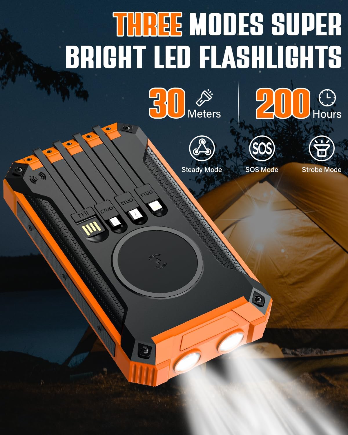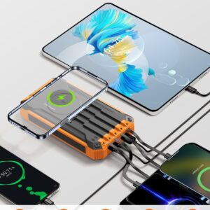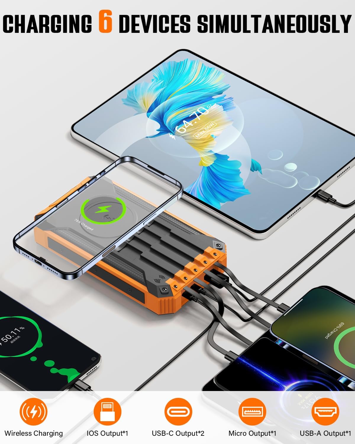 • 【4 câbles de charge intégrés et 3 ports】 Le chargeur solaire a intégré 4 lignes de sortie (USB-C/iOS/Micro-USB/USB-A) et 3 ports intégrés (entrée/sortie USB-C, entrée micro, USB-A -Sortie). Il charge jusqu’à 6 appareils simultanément, éliminant ainsi l’encombrement des câbles et garantissant que tous vos appareils ainsi que ceux de votre famille et de vos amis restent actifs.